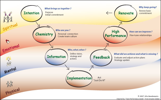 Dysfunctions arise when we try to skip a phase. Teams often get down to planning business (mental level) without a solid emotional connection. Agreeing on a clear vision and consensing the appropriate action plan then becomes cumbersome and implementation is undermined. Other teams make a good connection, focus well and do good planning, but neglect the follow-up with proper feedback and fine-tuning of their relationships. Others produce great results, yet success is meaningless because the basic focus (mission) and identification with the project hasn’t been renewed.